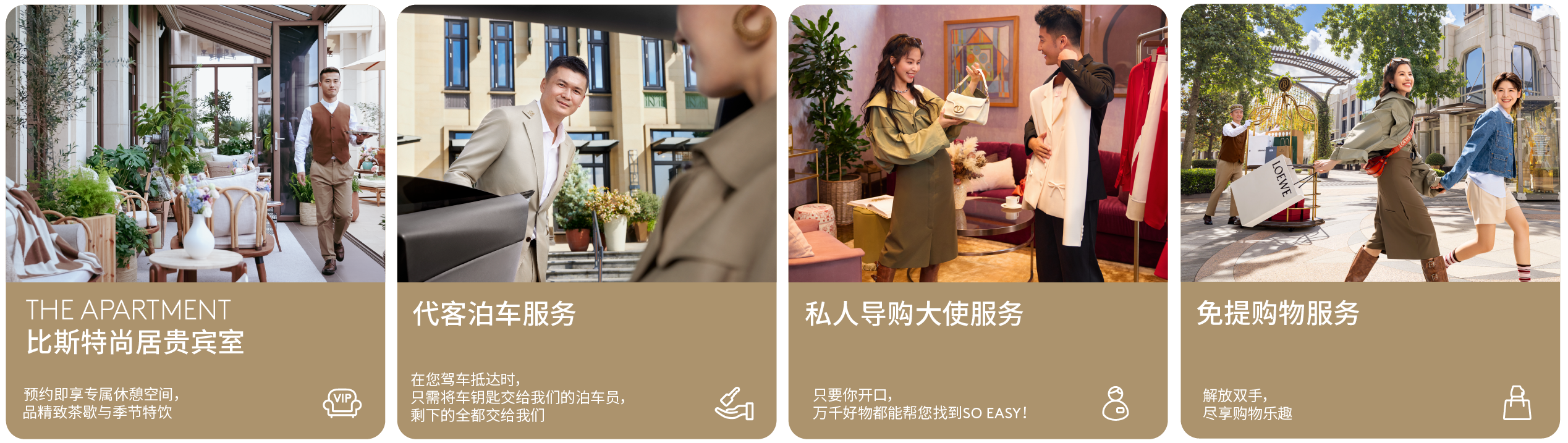 - -比斯特上海及苏州购物村还有专业的导购大使服务,在您需要的时候可以陪同您逛街,给与您专业的穿搭建议,如有需要可以拨打迎宾中心电话或至“比斯特Life”微信小程序会员中心预约此项服务。